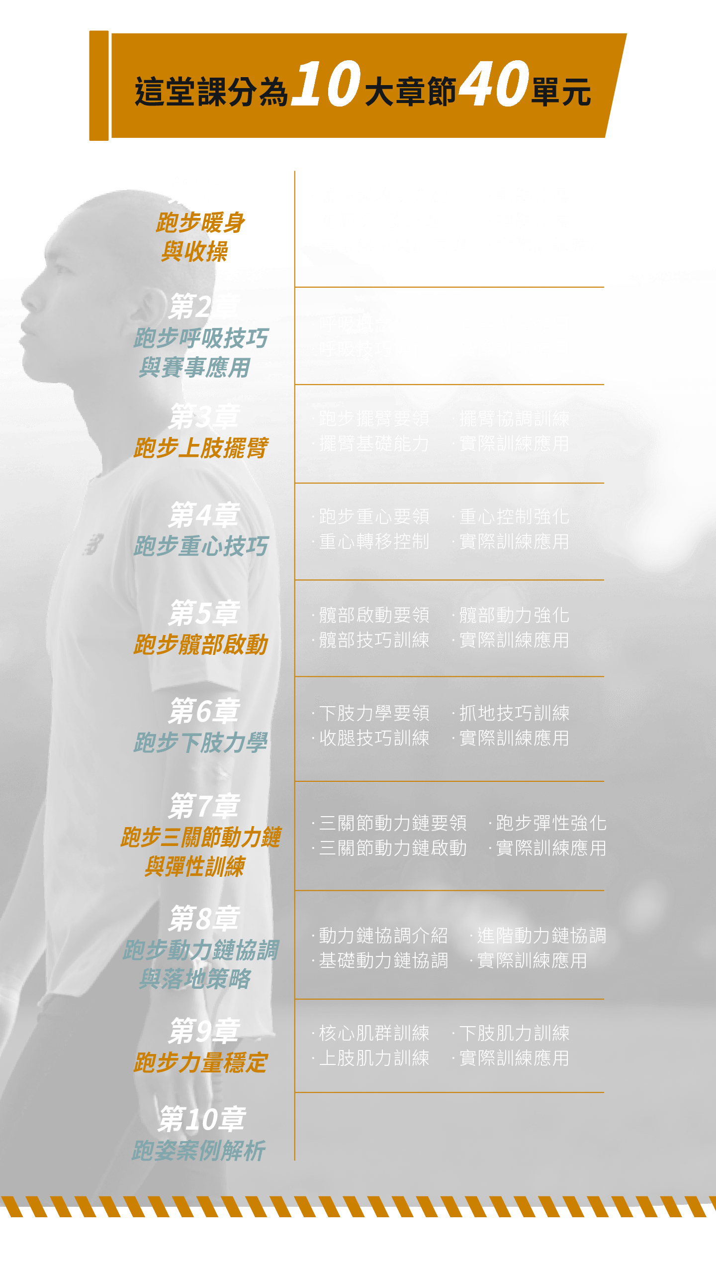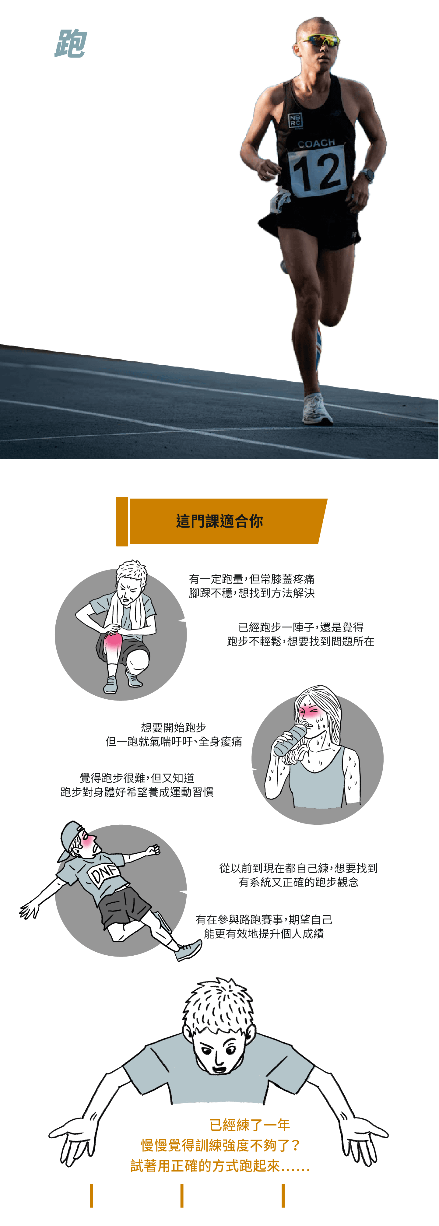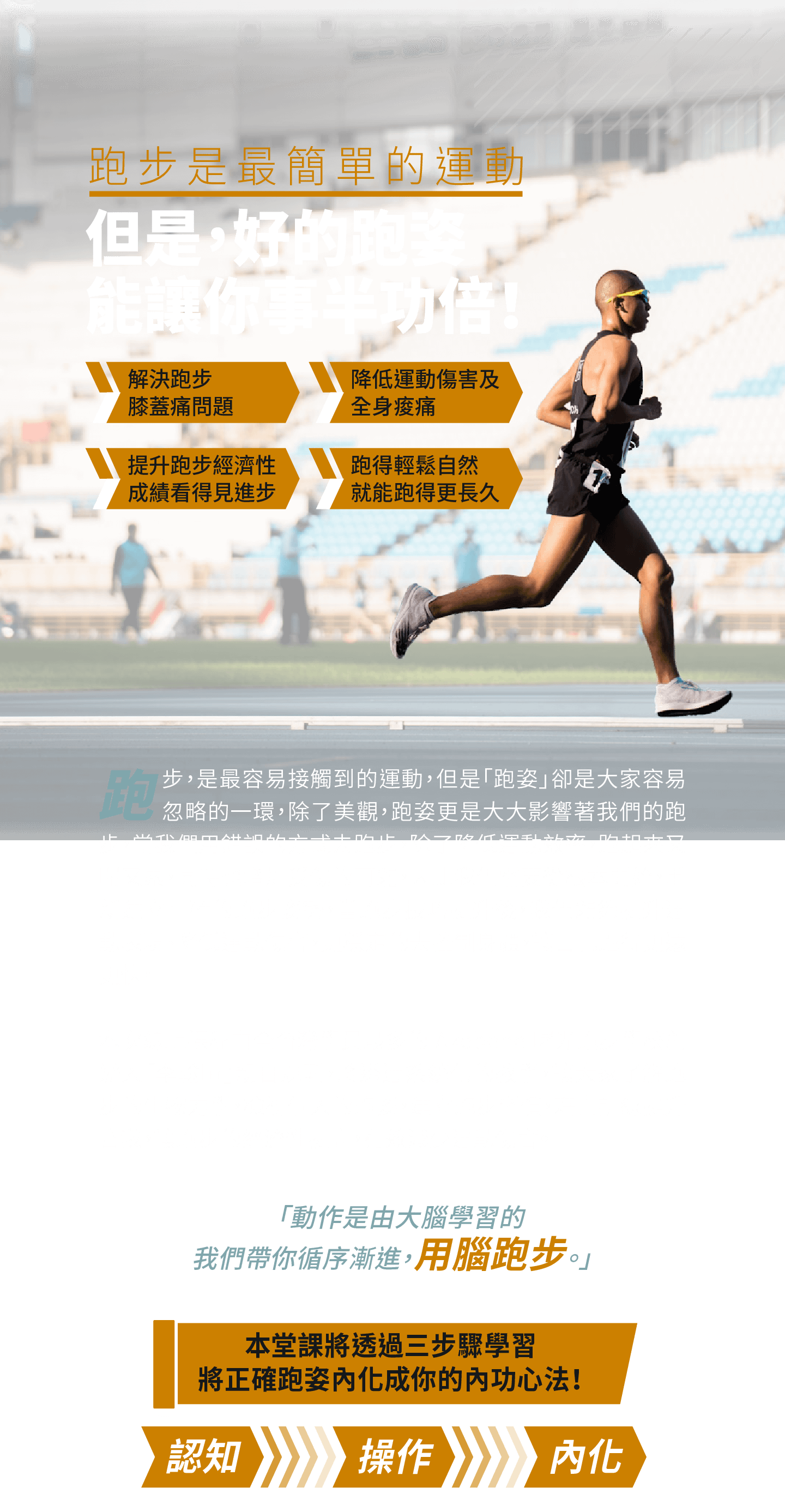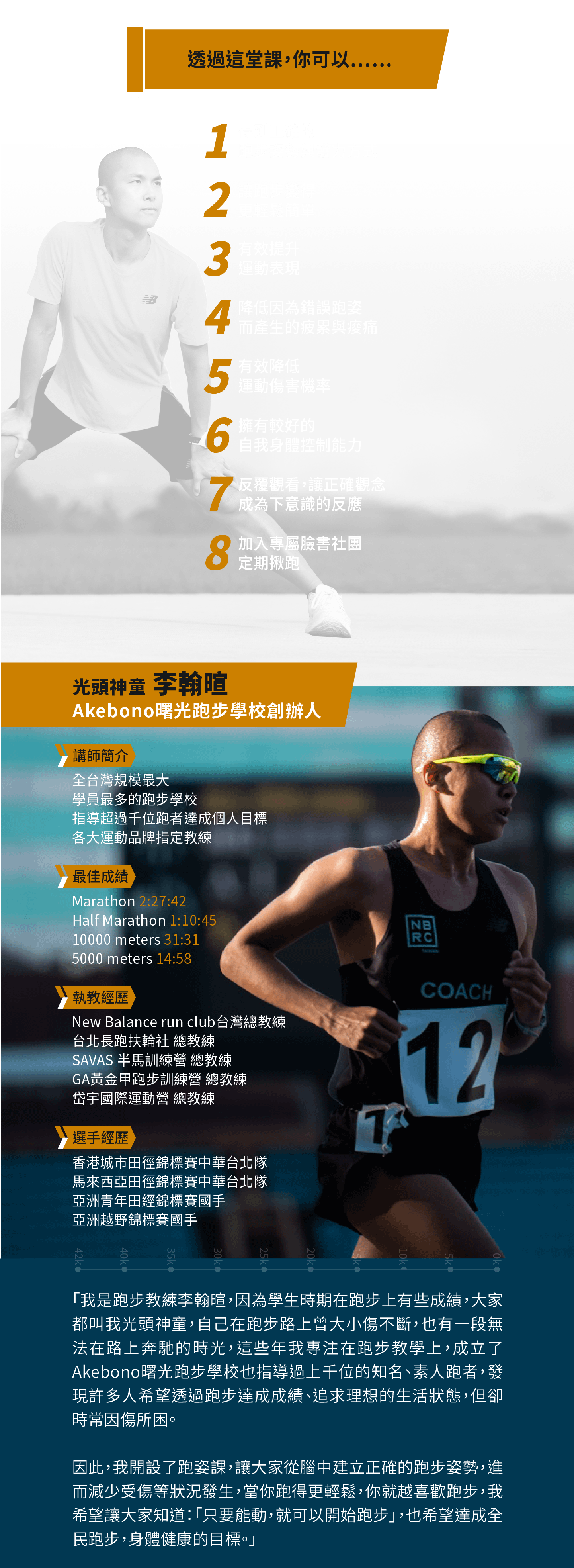 由 Akebono 曙光跑步學校創辦人李翰暄親自規劃,將透過系統化的教學,讓大家了解跑步的生物力學,檢視個人的跑姿,建立跑步習慣,藉由訓練提升自我,讓跑步的經濟性提高,有效減少運動傷害。跑姿對了,什麼都對了!光頭教練獨門秘笈帶你重新認識跑步,擺脫運動傷害,跑得更快、更遠、更健康。
